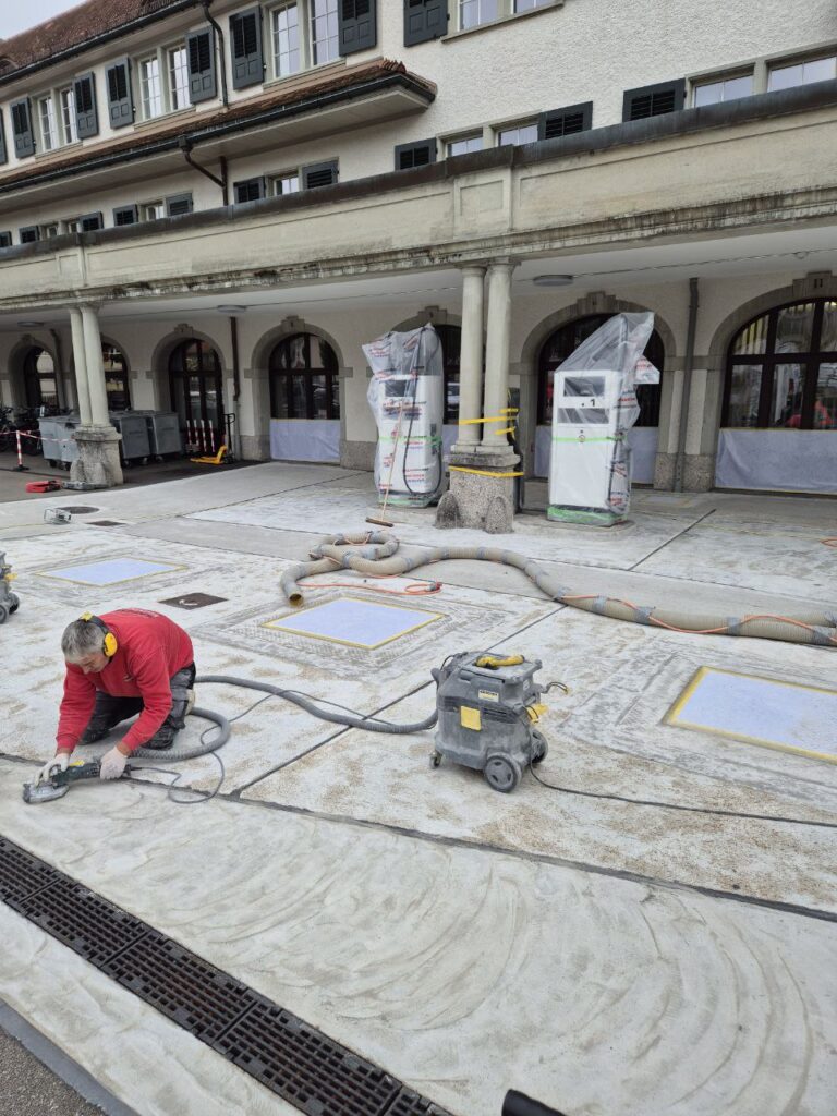 Bodenbeschichtung Tankstelle Herisau Projektjahr 2023Die Sapisol Bautenschutz GmbH durfte an einer stark frequentierten Tankstelle in Herisau ein hochwertiges Bodenbeschichtungssystem realisieren. Ziel war es, eine besonders widerstandsfähige, chemikalienbeständige und leicht zu reinigende Oberfläche zu schaffen, die den hohen Belastungen des täglichen Tankstellenbetriebs dauerhaft standhält. Ausgangslage Die bestehende Bodenfläche zeigte deutliche Verschleißspuren: Abgefahrene Beschichtungen, kleine Risse und Ölverfärbungen beeinträchtigten nicht nur das Erscheinungsbild, sondern stellten auch ein Sicherheitsrisiko dar. Kraftstoffe, Öle und Streusalz hatten die alte Schutzschicht über die Jahre angegriffen, sodass eine umfassende Erneuerung notwendig wurde. Die Betreiber wünschten sich eine Lösung, die sowohl optisch ansprechend als auch technisch belastbar ist und die geltenden Umweltschutzauflagen erfüllt. Unsere Massnahmen Gründliche Untergrundvorbereitung: Mechanisches Kugelstrahlen und Schleifen, um alte Beschichtungsreste, Ölfilme und lose Partikel vollständig zu entfernen. Riss- und Porenverschluss: Ausbessern kleiner Risse und Hohlstellen mit einem speziellen Epoxidharzspachtel, um eine dichte und tragfähige Basis zu gewährleisten. Aufbringen eines zweikomponentigen Epoxidharz-Systems, hoch beständig gegen Treibstoffe, Chemikalien und Frost-Tausalz-Zyklen. Rutschhemmende Endversiegelung, die auch bei Nässe und Ölfilm sicheren Halt bietet und die Reinigung erleichtert. Farb- und Markierungsgestaltung zur klaren Abgrenzung der Tank- und Fahrbereiche für eine übersichtliche Verkehrsführung. Ergebnis Die neu beschichtete Bodenfläche überzeugt durch hohe mechanische Belastbarkeit, hervorragende chemische Resistenz und eine moderne, saubere Optik. Die Betreiber profitieren von einer leicht zu pflegenden Oberfläche, die den Umweltschutzauflagen entspricht und den täglichen Betrieb sicher und effizient unterstützt.